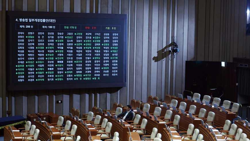 8월5일 서울 여의도 국회에서 열린 제427회 국회(임시회) 제3차 본회의에서 방송법 일부개정법률안(대안)이 가결되고 있다. /뉴시스 연합뉴스TV 노사가 사장추천위원회(사추위) 구성과 관련해 4차례…