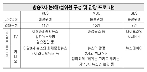 방송사의 논(해)설위원은 방송기자로 20년 이상 경험을 쌓은 부장급 이상 기자들이 맡고 있다.