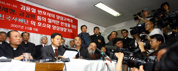 ▲ 지난 달 5일 서울 제기동 성당에서 열린 ‘김용철 변호사의 양심고백과 삼성, 언론, 검찰, 국세청, 금감원 등의 철저한 반성을 위한 천주교정의구현사제단의 호소와 양심성찰기도’ 기자회견에서 김용철 변호사(앞줄 왼쪽에서 두번째)가 양심선언을 하고 있다. |