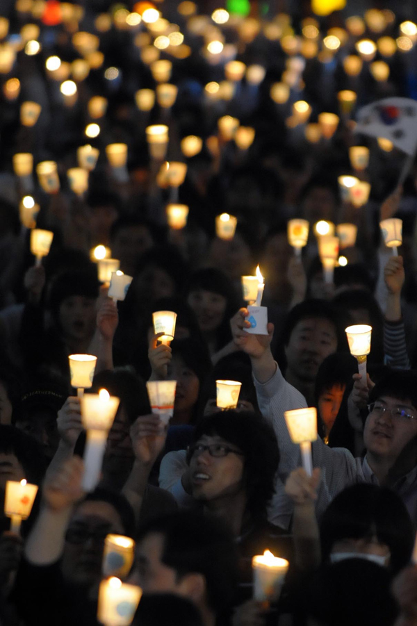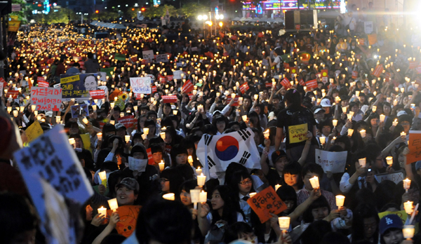 | ▲ 미국산 쇠고기 수입 반대 촛불 문화제가 열린 5일 오후 서울 파이낸스센터 앞에서 21세기 한국대학생연합 소속 대학생들을 비롯한 시민들이 촛불을 들고 구호를 외치고 있다. ⓒ뉴시스 | ||