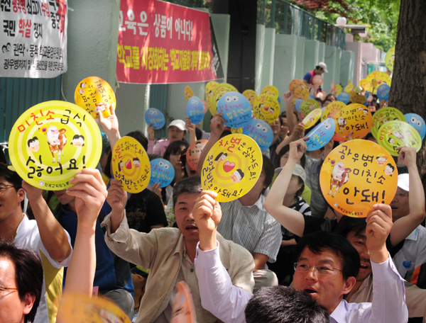 | ▲ (미친소 급식 싫어요) 3일 오후 서울 정부종합청사 후문 인도에서 전국교직원노동조합이 '4.15 공교육 포기,학교학원화 조치 철회하고 OECD수준 교육복지 실현'을 요구하는 전국지회장 결의대회를 갖고 있다. ⓒ뉴시스 | ||