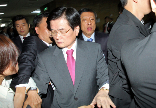 ▲ 이병순 사장이 12일 오전 국정감사에 출석하다 KBS 비정규직 사원들로부터 최근 해고 사태 등에 대한 항의를 받고 있다.(연합뉴스) |