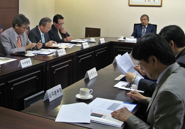 | ▲ 31일 열린 재·보궐선거 선거기사심의위원회 1차 회의에서 양삼승 선거기사심의위원장(사진 가운데)이 회의를 주제하고 있다.(사진=언론중재위) | ||