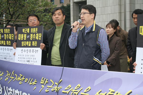 ▲ 부산일보노조가 전국언론노조와 함께 17일 오전 서울 중구 태평로 한국프레스센터 앞에서 기자회견을 열고 박근혜 한나라당 의원에게 정수재단을 사회에 환원할 것을 촉구했다. (이대호 기자) |