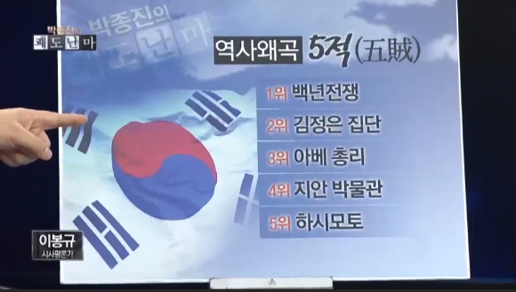 21일 저녁에 방송된 채널A ‘박종진의 쾌도난마’에서 패널로 출연한 이봉규 시사평론가(전 데일리안 TV본부장)의 역사왜곡 베스트5를 뽑으며 지난해 11월 민족문제연구소에서 제작한 다큐 영화 ‘백년전쟁’을 역사를 왜곡한 1위로 꼽았다.