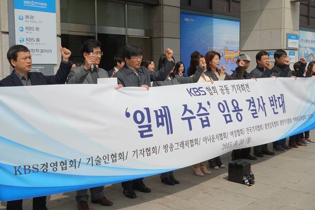 이날 여의도 KBS 본관 계단 위에서 열린 기자회견에는 KBS기술인협회·기자협회·경영협회·방송그래픽협회·여성협회·아나운서협회·전국기자협회·촬영감독협회·촬영기자협회·카메라감독협회·PD협회 등 KBS 내부 모든 직능단체들이 함께 했다. 이들 협회는 지난 26일부터 ‘일베 기자’의 임용을 반대하는 서명운동도 전개 중이다.