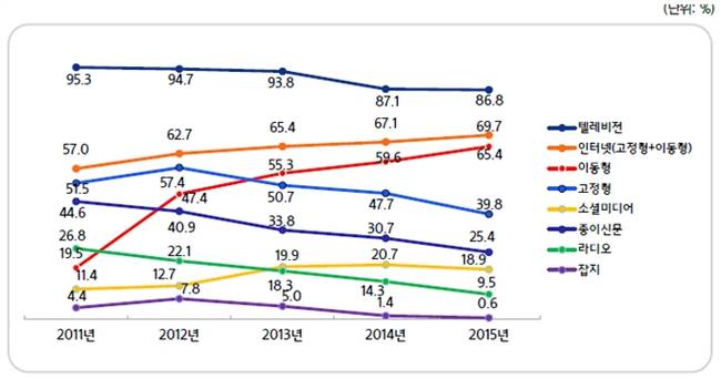 모바일을 통한 뉴스 이용률은 2011년 조사에서 11.4%에 불과했으나 스마트폰 보급에 따라 4년 사이 6배 가량 증가했다.