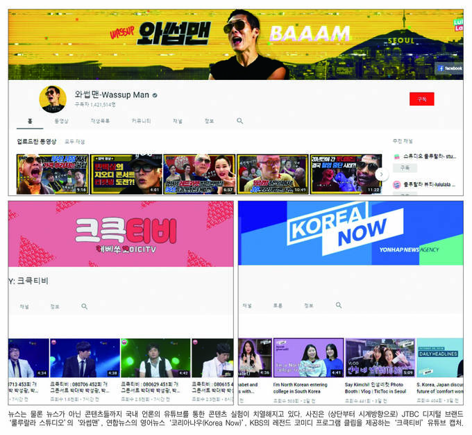 언론사 차원에선 기존 주요 뉴스나 몇몇 프로그램을 중심으로 이뤄져 온 디지털 부문 콘텐츠 포트폴리오가 확장되는 측면도 있다. CJ ENM은 이런 디지털 포트폴리오 전략을 가장 적극적으로 구사해 온 곳 중 하나다. 스튜디오온스타일, 흥베이커리 등 디지털 스튜디오 다섯 곳에서 음악, 일상, 뷰티, 여성, 젊은 층, 자기 계발 등 트렌디한 키워드를 바탕에 두고 콘텐츠를 제작 중이다. 최근 언론사 중 두각을 나타낸 JTBC 디지털 브랜드 ‘스튜디오 룰루랄라’의 ‘와썹맨’, SBS 브랜드 ‘모비딕’의 ‘양세형의 숏터뷰’ 같은 사례를 보면 ‘기획력’과 ‘주요 캐릭터의 매력’도 유튜브 분야 선전에 중요한 요소다. 콘텐츠 기업으로서의 언론사로선 유념할 지점으로 보인다.