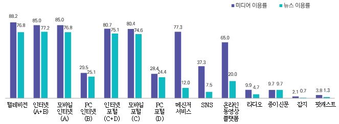 뉴스 이용률에선 인터넷 기반 매체가 강세였지만, 신뢰도 면에선 여전히 전통매체가 강세였다. 매체별 뉴스 신뢰도를 5점 척도(이하 동일)로 봤을 때 전통매체는 텔레비전(3.67점), 종이신문(3.36점), 인터넷 포털(3.36점), 라디오(3.27점) 순이었고, 인터넷 기반 매체 신뢰도는 인터넷 포털과 언론사 웹사이트나 앱(3.06점)을 제외하고는 모두 3점 미만이었다.