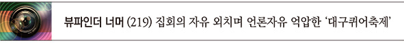 20일 대구 도심에서 열린 퀴어문화축제는 대규모 경찰 병력의 호위를 받으며 진행됐다. 도심 한복판의 차량 통행은 통제됐고 하루 종일 대구 최대 번화가 일대는 극심한 교통 혼잡에 시달렸다. 행렬은 수십 개의 깃발과 함께 도로를 가득 메웠다. 조직위는 수십 년간 이어진 반대 여론에도 불구하고 헌법 제21조가 보장하는 집회의 자유를 내세워 집회를 개최했고, 공권력은 헌법이 부여한 의무에 따라 도로 사용을 보장하며 행렬을 보호했다. 참가자들은 헌법이 보장한 권리를 당당히 누렸다. 그러나 같은 조항에서 함께 보장되는 또 다른 자유, 언론의 자유는 현장에서 억압당했다.