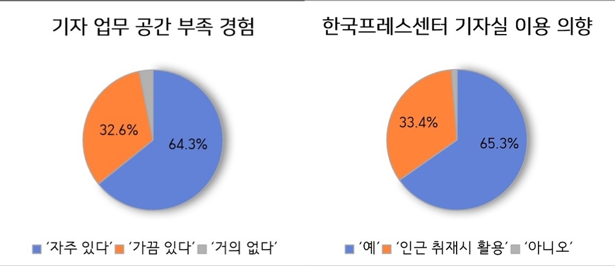 서울에서 일하는 일선기자 대부분이 전화 취재나 기사 작성 시 적절한 공간을 찾지 못해 어려움을 겪고 있는 것으로 나타났다. 또한, 상당수는 정부 기관이나 주요 기업체 다수가 위치한 서울 광화문 인근에 기자실이 마련되면 이용할 의사가 있다고 밝혔다.