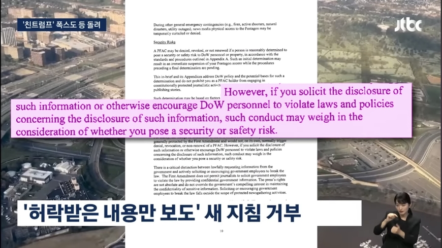 앞서 미 국방부는 기밀 여부와 무관하게 사전에 승인받지 않은 내용을 보도할 경우 출입 권한을 박탈한다는 내용 등이 담긴 서약서에 14일 오후 5시까지 서명할 것을 출입기자들에게 요구했다. 응하지 않을 경우 24시간 내 출입증을 반납하고 청사를 떠나야한다고 통보했다. 극우 매체로 평가받는 ‘원아메리카뉴스’만 해당 지침에 서약한 것으로 전해진다.