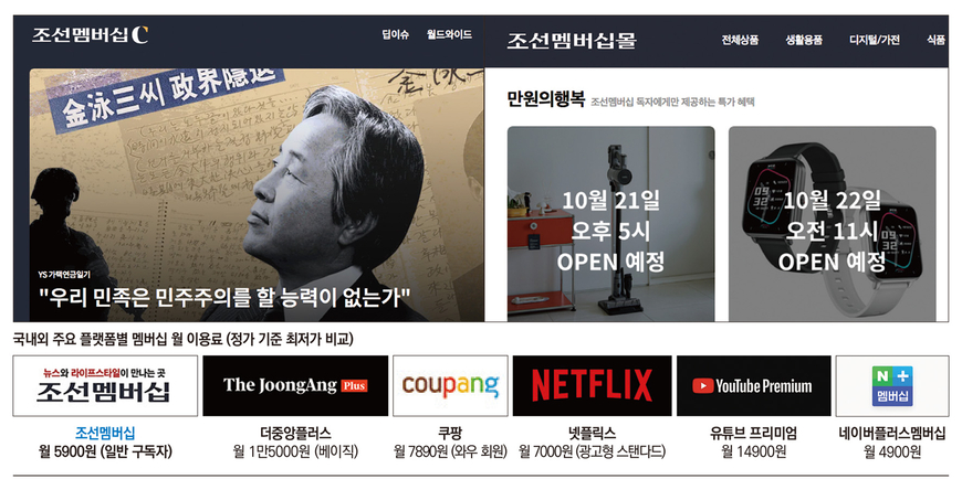 조선일보가 유료 멤버십 서비스 ‘조선멤버십’을 15일 선보였다. 기성 언론사 중에선 2022년 10월 ‘더 중앙 플러스’로 전사적 디지털 유료화에 첫발을 뗀 중앙일보 이후 3년 만에 나온 시도다. “1등 신문 1등 혜택”을 표방하는 조선일보의 이번 시도가 유료화에 안착하는 결과를 낼 수 있을지 주목된다.