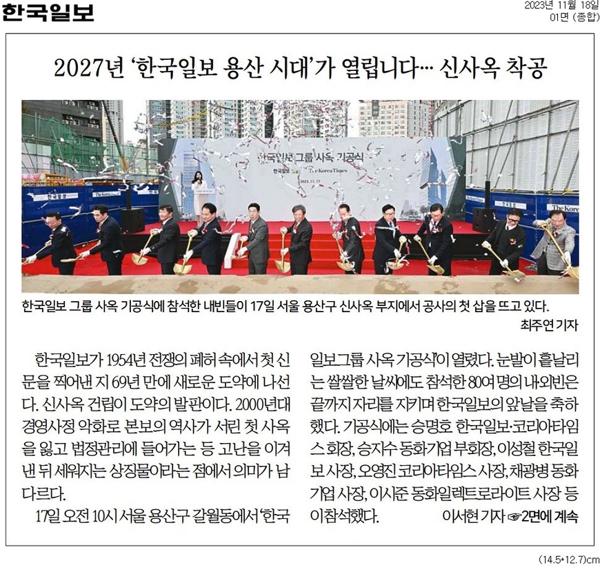 2023년 신사옥 착공 당시 한국일보는 관련 기사를 통해 “2000년대 경영사정 악화로 본보의 역사가 서린 첫 사옥을 잃고 법정관리에 들어가는 등 고난을 이겨낸 뒤 세워지는 상징물이라는 점에서 의미가 남다르다”며 “도약의 발판”이라 전한 바 있다.