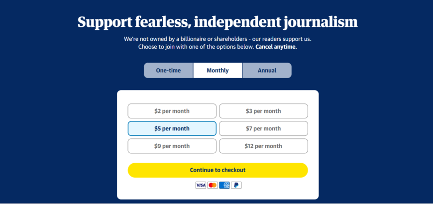 과거 웹사이트엔 ‘기부하기’(donate)와 ‘구독하기’(subscribe) 두 버튼이 있었지만 복잡하다는 판단에 ‘지원하기(support)’로 통합했다. 버튼을 누르면 다양한 지원방식을 선택할 수 있는 옵션 제공으로 이어지는 식이다. 정기적인 월간 또는 연간 기부는 가디언이 재정적 지원을 받는 “가장 영향력 있는 방식”으로 이는 기부자뿐 아니라 부가가치가 높은 구독 상품에 가입한 모든 이용자를 포함한다. 구독 상품엔 요리 앱 ‘피스트’(Feast)와 프리미엄 앱 등이 포함된다.