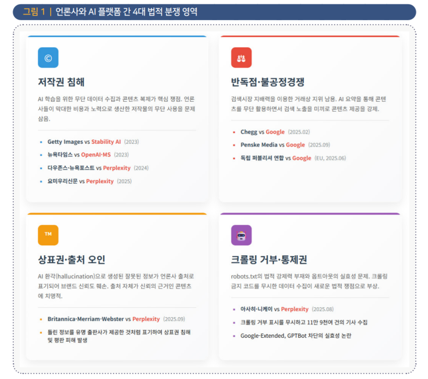 생성형 AI 등장 초기 언론사와 AI 기업간 법적 분쟁이 주로 저작권 침해에 집중한, 즉 AI 모델 학습을 위한 무단 데이터 수집이나 콘텐츠 복제를 중심으로 한 전통적 저작권 법리를 중심으로 전개됐다면 2025년 들어 다른 양상이 나타나는 모양새다. 저작권 침해란 단일 법리를 넘어 반독점, 상표권, 크롤링 통제 등 다층적 법적 전략을 구사하며 AI 플랫폼 기업에 대한 압박을 강화하는 양상이 대표적이다.