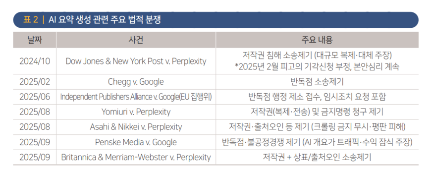 ‘롤링스톤’과 ‘버라이어티’ 등을 보유한 미국 펜스케 미디어(Penske Media)는 구글 ‘AI 오버뷰’가 자사 기사를 무단 이용해 트래픽과 수익을 침해했다고 주장하며 소송(2025년 9월)을 제기했다. 구글이 검색 시장 90%에 달하는 지배력을 기반으로 언론사 콘텐츠를 대가 없이 활용하고 있고 이에 따라 제휴 수익이 3분의 1로 줄었다며 펜스케 미디어는 구글의 검색시장 지배력 남용에 관한 반독점 소송을 제기했다. 유럽에서도 독립 퍼블리셔 연합(IPA)이 구글의 AI 요약이 언론사에 돌이킬 수 없는 피해를 준다며 EU집행위원회에 반독점 조치를 촉구하는 제소를 했다.