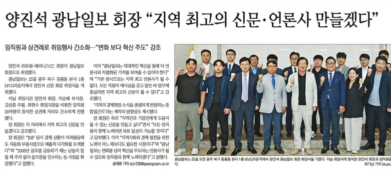 양진석 광남일보 회장은 9월25일 취임 당일 기자들과 만나 자신이 걸어온 역정을 언급하며 “광남일보를 지역 최고의 신문으로 만들겠다”고 했다. 이어 “기자들을 잘 대우하는 신문이 최고의 신문”, “대대적인 혁신을 통해 타 언론사와 차별화된 가치를 보여줄 것” 등을 강조했다. 양 회장은 자동차 부품 제조·판매 사업이 주력인 호원을 이끌면서 전남 나주시 다도면에 해피니스컨트리클럽(퍼블릭 27홀·회원제 18홀)을 운영하고 있다. 지난해 기준 호원과 계열사 매출액은 4603억원, 해피니스컨트리클럽 1186억원이다. 그는 2023년 2월부터 제17대 광주경영자총협회 회장을 맡고 있다.