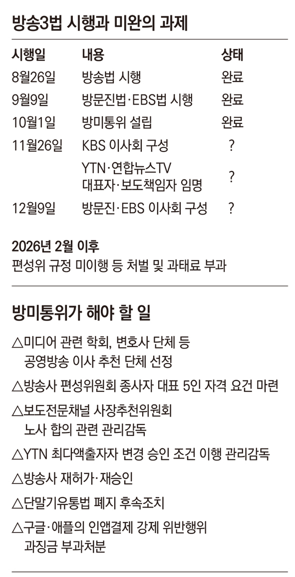 방송법 부칙에 ‘3개월 이내’로 못박아둔 KBS 등 공영방송 새 이사회 구성, YTN·연합뉴스TV 대표자 및 보도책임자 선임이 기한 내 이뤄질 가능성은 희박해졌다. 방미통위는 방송법 후속조치로 공영방송 이사를 추천하는 미디어 관련 학회, 변호사 단체를 선정해야 했다.