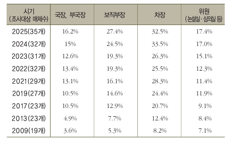 한국여성기자협회가 최근 발간한 <저널W>의 ‘2025 여성 기자 보직 현황’에 따르면 10월 기준, 조사 대상 35개 언론사에서 여성 임원(편집인, 사장, 부사장, 전무, 상무, 이사 등) 수는 모두 합쳐 13명이었다. 여성 임원은 2023년 13명으로 사상 최다를 기록한 뒤 지난해 10명으로 감소했으나 올해 다시 13명이 됐다. 전체 임원(176명)에서의 여성 비율도 7.4%로 지난해 6.2%에서 소폭 높아졌다.