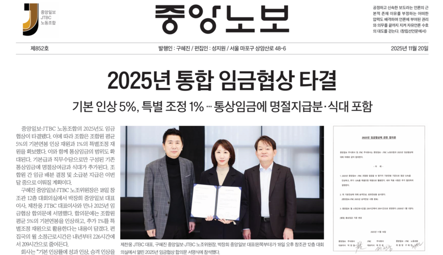 중앙일보·JTBC 노사가 기본연봉을 평균 5% 인상하는 2025년 임금협상을 체결했다.