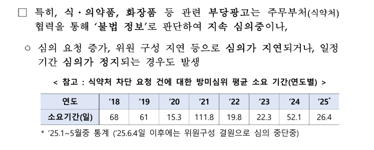 정부도 사후 차단 체계의 구조적 문제로 방미심위 심의 지연 및 정지 사태를 원인으로 꼽았다. “방심위원 교체 지연 등의 사유로 상당한 기간 방심위 심의가 지연되거나, 정지되는 사례가 주기적으로 발생”한다는 것이다. 국가정책조정회의 발표 자료에 따르면 올 4월 류희림 전 방심위원장 사의 표명 이후 현재까지 방심위원 교체가 지연되고 있으며, 6월4일 이후에는 위원 정족수 부족으로 식약처의 차단 요청 건에 대한 심의마저 중단된 상태다.