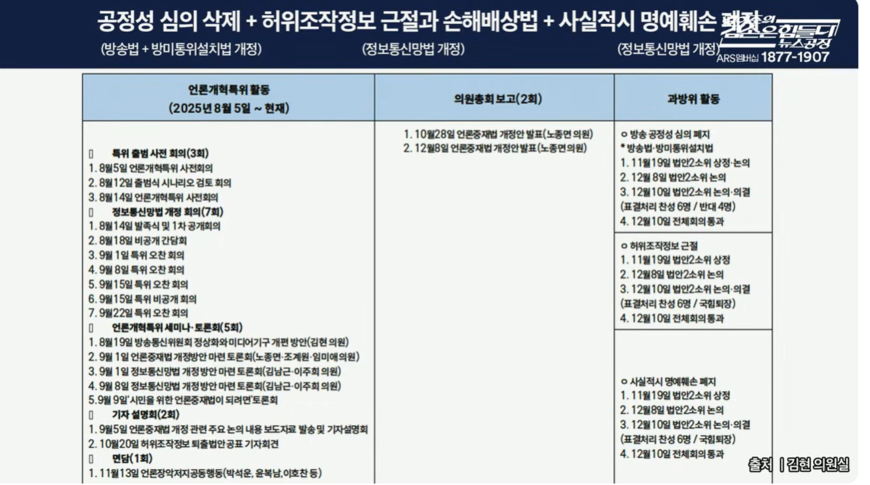 다만 한국기자협회 등 언론 현업단체는 언론의 권력 감시 기능 위축과 일반 국민의 표현의 자유 침해를 우려하면서 ‘숙의’를 요구해 왔다. 그러나 민주당은 속도전을 끝내 포기하지 않았다. 충분히 “설득”하고 사회적 논의를 다 했는지도 알 수 없다. 김현 의원이 이날 방송에서 공개한 활동 자료에 따르면 언론특위가 망법 처리 관련해 면담을 가진 건 11월13일 단 한 차례로 언론장악저지공동행동 대표자(민주사회를위한변호사모임, 민주언론시민연합, 전국언론노동조합)들만 만났다.