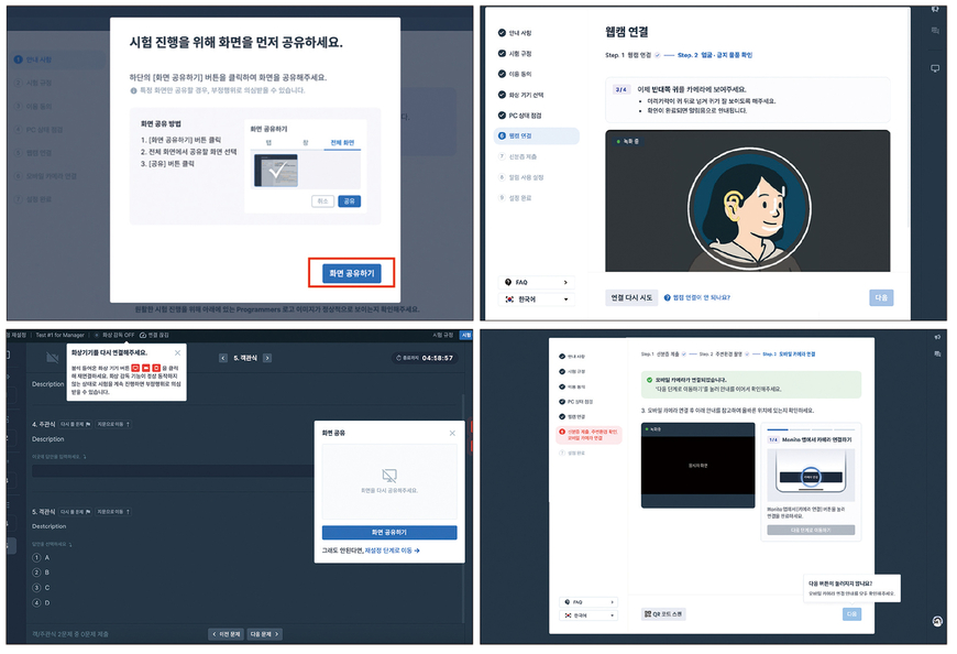 온라인 필기전형은 ‘모니토’ 프로그램을 통해 이루어진다. 응시생이 온라인 시험장에 접속하면 감독관에게 모니터 화면이 공유되고, 웹캠·마이크가 활성화된다. 외부 프로그램 접근은 즉각 차단된다. 또한 응시생들은 스마트폰 앱으로 시험장 주변 환경을 촬영해 인증해야 한다. 시험 중에는 삼각대를 활용해 응시자의 양팔과 귀가 보이도록 측면을 실시간 중계해야 한다. 카메라가 꺼지거나 화면 공유가 중단되면 부정행위로 간주될 수 있다.