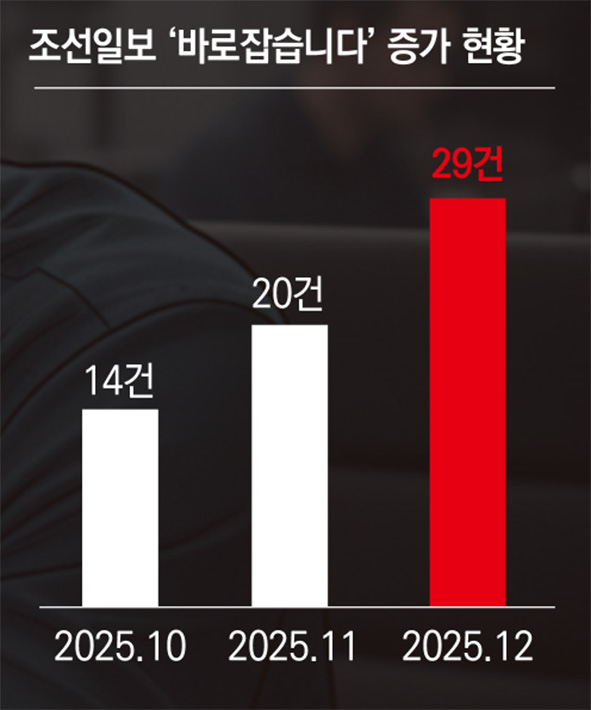 지면 오탈자 발생 빈도에 대해서도 10명 중 8명(79.6%)이 늘었다고 답했다. 실제로 본보가 조선일보의 ‘바로잡습니다’ 게재 건수를 집계(홈페이지 공지 기준)해보니 지난해 9월과 10월 각각 11건, 14건이던 것이 11월 20건, 12월 29건으로 증가했다. 전년 동기간 8건(11월), 7건(12월)에 비해서도 늘었다. 다만 ‘바로잡습니다’ 게재 기준은 편집국 판단에 따라 달라질 수 있고, AI 교열 전면 도입 첫 달엔 기자들이 매뉴얼을 숙지하지 못한 게 영향을 미쳤을 수 있다.