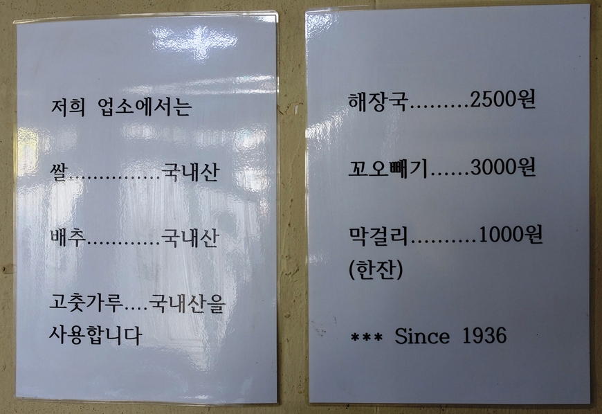 정말이지 조그맣고 소박한 밥집이었다. 그런데, 놀라워라. 1936년부터 영업을 했단다. 업력이 1세기에 육박한다는 이야기 아닌가. 일제강점기였던 1936년은 선친이 태어나기도 전이니 ‘까마득한 옛날(?)’이라 불러야 할까?