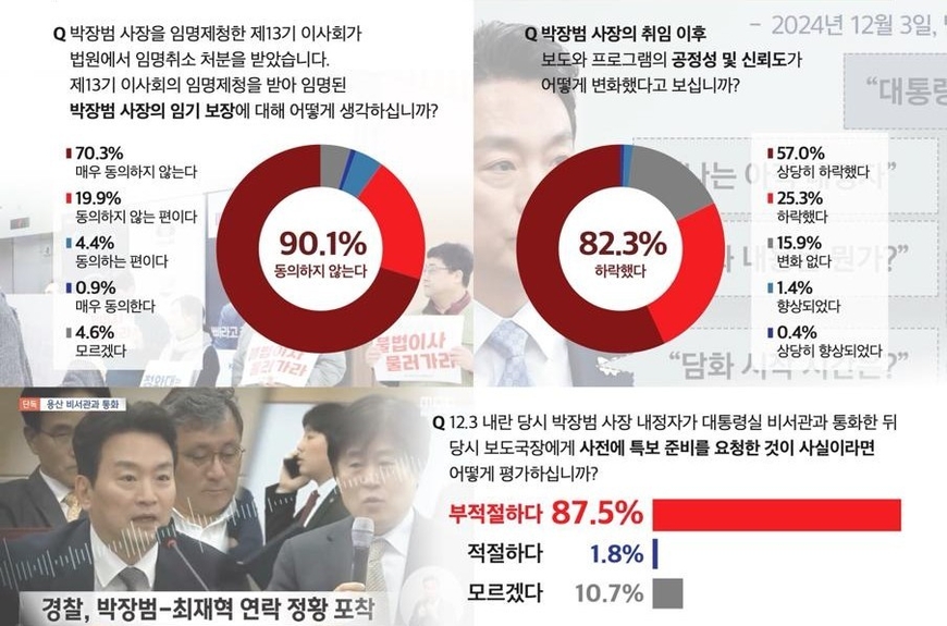 최근 법원에서 박장범 사장 임명을 주도한 야권 측 KBS 이사들이 임명 취소 처분을 받은 상황에서 ‘박장범 사장의 임기 보장에 대해서 어떻게 생각하는지’에 대해선 90.1%의 조합원이 ‘동의하지 않는다’고 답했다.