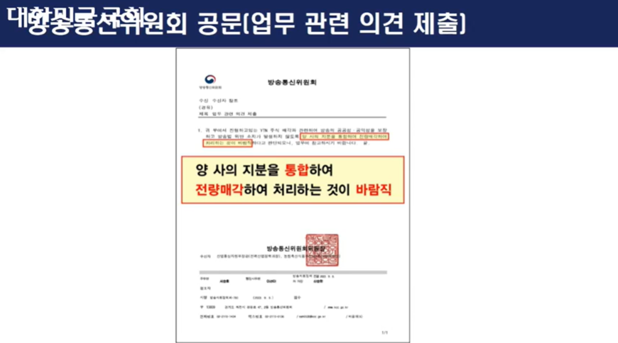 노종면 더불어민주당 의원은 10일 국회 과학기술정보방송통신위원회가 진행한 방송미디어통신위원회 업무보고에서 공문 한 장을 공개했다. 방통위가 2023년 9월5일 산업부와 농림축산식품부에 보낸 공문이다. 방통위는 이 공문에서 공기업 한전KDN과 한국마사회가 보유한 YTN 지분을 통합해 전량 매각 처리하는 것이 바람직하다고 밝혔다. 공문 수신 당일 한전KDN과 한국마사회는 YTN 주식 공동매각협약서를 체결했고, 사흘 뒤 지분매각 사전공고를 냈다. 그리고 45일 만에 이뤄진 경쟁 입찰에서 유진이엔티(유진그룹)가 최종 낙찰자로 선정됐다.
