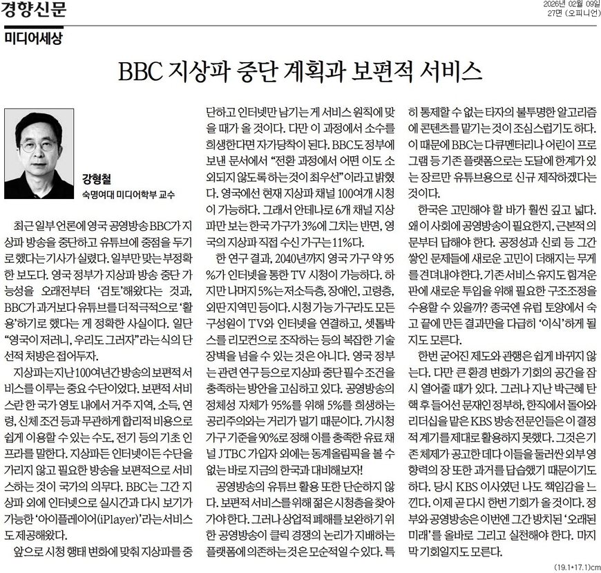 이 같은 BBC 행보에서 중요한 지점은 유튜브와 파트너십 체결이란 결과 자체가 아니다. KBS 이사를 지냈던 강형철 숙명여대 미디어학부 교수는 9일 경향신문 기고 <BBC 지상파 중단 계획과 보편적 서비스>를 통해 이번 BBC의 결정을 두고 “영국이 저러니, 우리도 그러자”라는 식의 단선적 처방을 경계해야 한다는 입장을 피력했다. “왜 이 사회에 공영방송이 필요한지, 근본적 의문부터 답해야” 하고, “공정성과 신뢰 등 그간 쌓인 문제들에 새로운 고민이 더해지는 무게를 견뎌내”지 않고서는 “유럽 토양에서 숙고 끝에 만든 결과만을 다급히 ‘이식’하게 될지도 모른다”는 것이다.