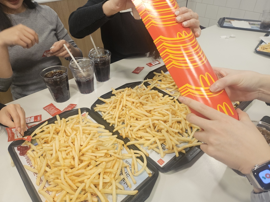 한편 몸을 쓰며 ‘도파민’을 분출하는 경도 모임과 달리, 감튀 모임은 비슷한 취향을 가진 사람들이 깊이 있는 대화를 나누는 사랑방에 가까웠다. 8명의 참가자가 20개가 넘는 감자튀김을 주문해 산처럼 쌓아놓고, 어느 브랜드의 감자튀김이 가장 맛있는지 최적의 소스 조합은 무엇인지 진지하게 토론했다. 장 기자는 이 모습이 마치 예능 프로그램 ‘흑백요리사’의 미식 평가 현장 같았다고 묘사했다.