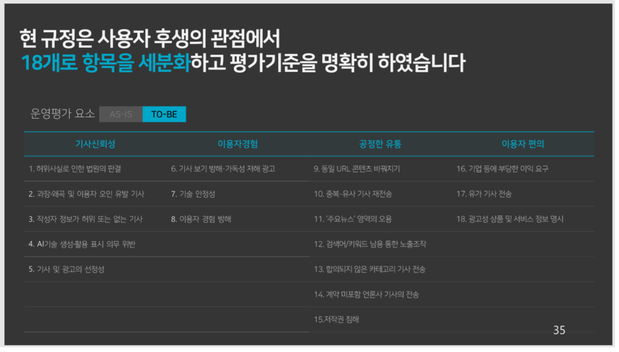 기존 제휴사의 규정 준수여부와 제재 등을 결정하는 운영평가위는 풀에서 무작위 선정한 15인의 위원으로 구성된다. 반년마다 위원 절반을 신규 위촉한다. 운영평가 절차는 모니터링 결과를 바탕으로 매월 운영평가를 실시해 건별로 언론사 소명을 받고 ‘부정평가 점수’, 즉 벌점 부과 여부를 결정하는 식으로 진행된다. 부정행위로 판단하는 구체적 유형은 기존 10개에서 18개 항목으로 세분화하고 평가기준을 명확히 했다. 평가요소로는 ‘허위사실로 인한 법원의 판결’, ‘AI 기술 생성·활용 표시 의무 위반’, ‘작성자 정보가 허위 또는 없는 기사’, ‘주요 뉴스 영역의 오용’ 등이 포함됐다. 과거 제평위 시절 사문화된 규정이나 시대상을 반영해 바꾼 결과로 볼 수 있다.