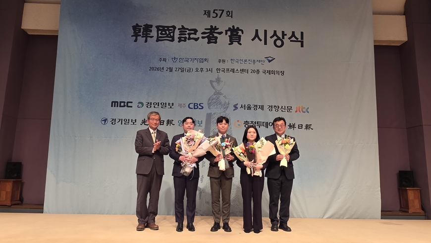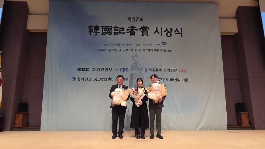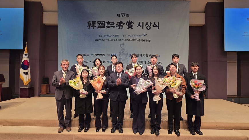 2025년을 빛낸 최고의 보도를 가려 상을 주고 격려하는 제57회 한국기자상 및 제16회 조계창 국제보도상 시상식이 27일 서울 중구 한국프레스센터 20층 국제회의장에서 열렸다. 이날 시상식에선 총 8편의 기사로 43명의 기자가 트로피를 받았다.