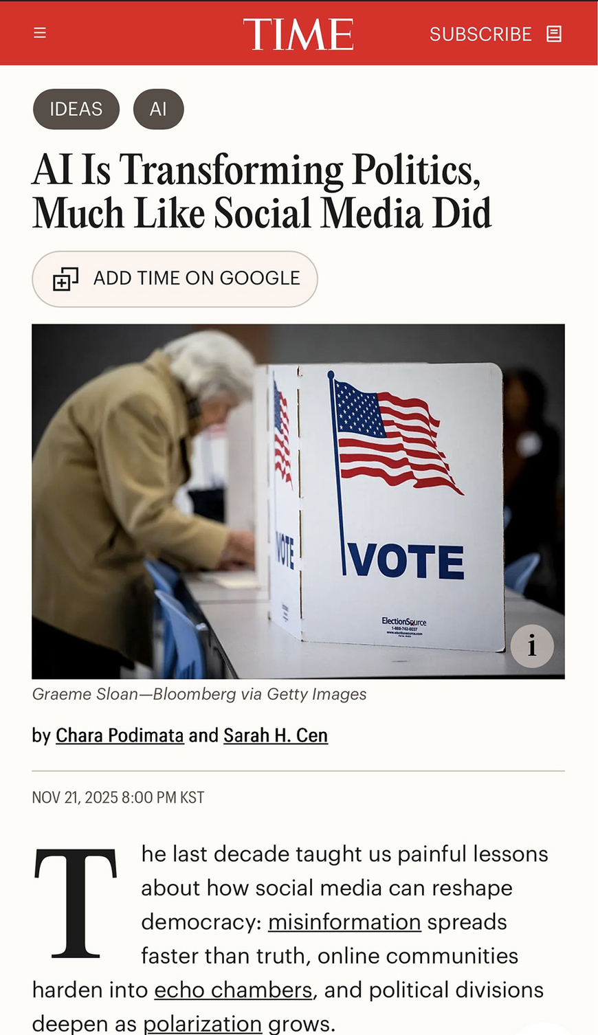 현실 정치에서 AI가 영향을 미칠 소지도 이미 거론되고 있다. 미국 타임지는 지난해 9월 기사를 통해 AI가 정치정보의 새로운 그릇(vessel)이자 심판자(arbiter)가 됐다고 전했다. 이 매체는 2024년 미국 대선 기간 축적 데이터를 분석한 연구를 인용해 “또 다른 기술의 물결이 유권자들이 선거 정보를 접하는 방식을 변화시키고 있다. 다만 더 빠르고, 대규모로, 훨씬 덜 투명하다”고 했다.
