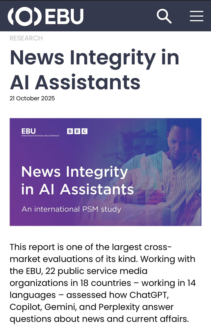 지난해 10월 유럽방송연합(EBU)은 BBC를 포함한 22개 공영방송사가 협력해 수행한 연구(‘News Integrity in AI Assistants’)를 공개했다. 챗GPT, 코파일럿, 제미나이, 퍼플렉시티 등 4개 AI 모델을 대상으로 14개 언어 3000건의 뉴스 관련 질의응답을 분석한 결과 답변 약 45%에서 중대 오류가 나타났다. 가장 큰 문제가 출처 표기(31%)였다. 출처가 없거나 엉뚱한 매체를 출처로 꼽는 일이 빈번했는데, 보고서는 이런 정보가 객관적 사실인양 전달될 때 책임소재 문제와 함께 시민들의 민주적 참여를 저해할 수 있다고 지적했다.