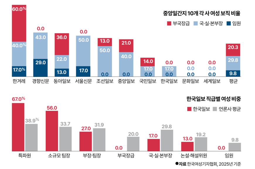 한국일보지부는 그러면서 “성비 불균형은 단순히 숫자의 문제가 아니라 뉴스 가치를 판단하고 지휘하는 능력의 감소 및 시선의 비대칭을 의미한다. 동질적인 배경을 공유하는 남성 간부들이 의사결정을 독점하는 구조에서는 사회의 다원적 가치를 온전히 담아내고 여러 독자층에게 소구하는 저널리즘을 구현할 수 없다”고 강조했다.