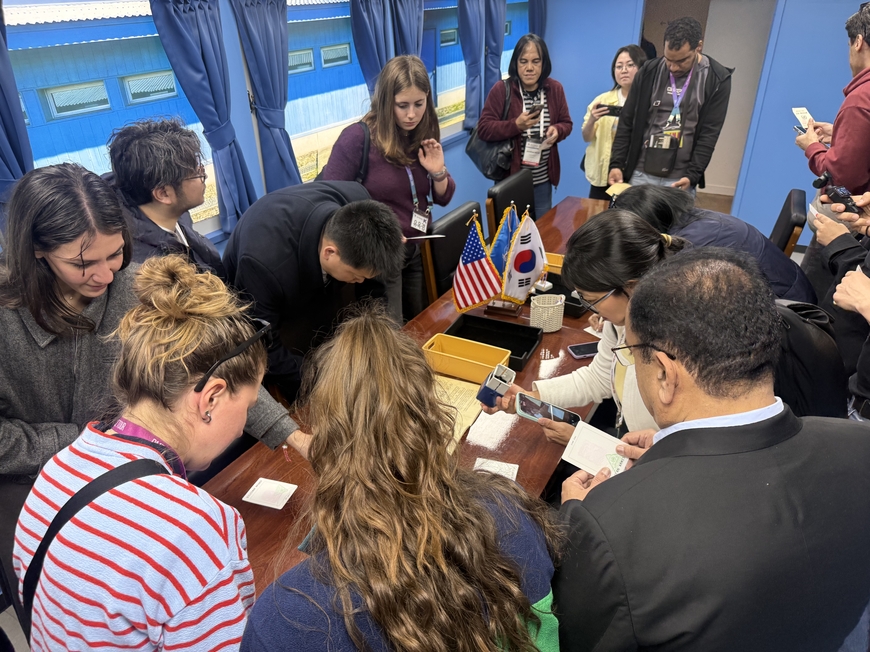 특히 기자들은 옛 미군 볼링장을 리모델링한 ‘갤러리 그리브스’ 내부를 구석구석 살폈다. 전시된 정전협정서 사본 앞에서 가이드의 설명을 경청하며 연신 카메라 셔터를 누르거나 휴대전화로 현장을 기록하기도 했다. 카메라를 바삐 움직이며 취재에 열의를 보인 체코 CNN 프리마뉴스의 야쿱 리하 기자는 “세계기자대회가 끝난 뒤 일주일간 더 머물며 탈북민과 이야기를 나눠볼 계획”이라고 했다. 그는 “오늘 일정과 탈북민 인터뷰를 바탕으로 한국에 관한 기사를 쓰려고 한다. 모든 자료를 확보해 가장 강렬한 주제가 무엇인지 판단해 최종적으로 기사 주제를 결정할 것”이라며 “현장을 보여줄 수 있는 영상 자료가 필요할 수 있겠다고 생각해 영상도 함께 촬영하고 있다”고 설명했다.