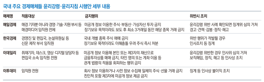 세 언론사 모두 윤리강령 적용 대상을 조직 구성원 전체로 확대했다. 매일경제는 윤리강령 적용 주체를 기자뿐 아니라 경영, 기술, 지원 부서 등 매경미디어 임직원 전체로 확대했다. 이데일리는 편집국 소속 임직원에 더해 배우자나 직계 존비속, 동거가족까지 적용 대상에 포함했다. 이들 언론사는 친인척 등 제3자에게 정보를 넘겨 우회 투자하는 행위도 금지했다.
