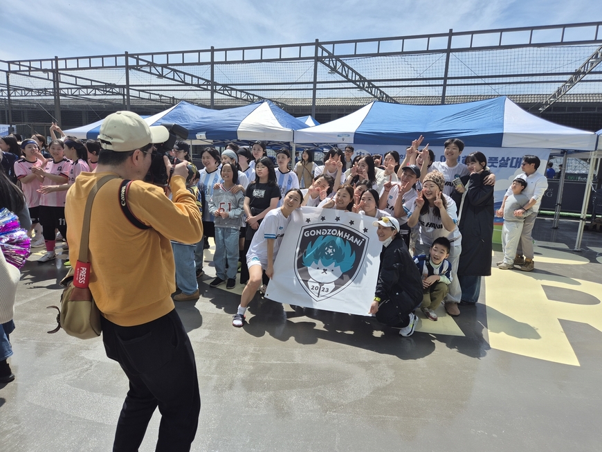 박종식 한겨레신문 기자는 풋살장을 종횡무진 뛰어다니는 한겨레 선수들을 카메라에 담느라 여념이 없었다. 박 기자는 중간중간 한겨레 주장이자 골키퍼인 장수경 기자가 선방할 때마다 “나이스!”를 외쳤다. 2023년 1회 대회부터 한겨레 골문을 든든히 지키고 있는 장 기자는 박 기자의 아내다. 아내를 향한 응원 한마디 부탁에 박 기자는 “거미손 장수경씨 끝까지 다 막아주세요. 뭐든지 다!”라고 웃었다.