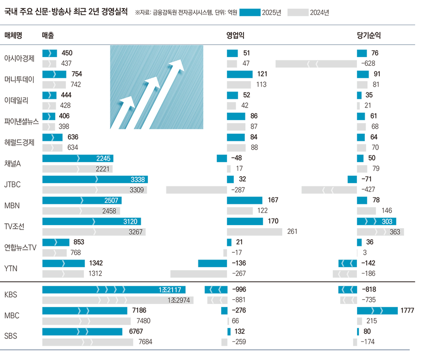 지난해 주요 언론사들의 경영 성과가 한 해 전과 비교해 대부분 개선된 것으로 나타났다. 방송광고 시장 악화 직격탄을 맞은 KBS, MBC, SBS 등 지상파 방송 3사를 제외하면 대부분 매출액이 소폭 늘었다. 매출이 전년보다 감소했어도 영업이익이 증가하거나 대규모 영업적자에서 흑자로 전환된 경우도 있었다. 이는 언론사들의 전반적 긴축경영 흐름 속 신문 구독 및 광고 수익 등의 본업보다 신사업 수익이나 부동산 처분, 주식매도 등의 단발성 수익 등이 매출 상승을 견인했기 때문인 것으로 나타났다.