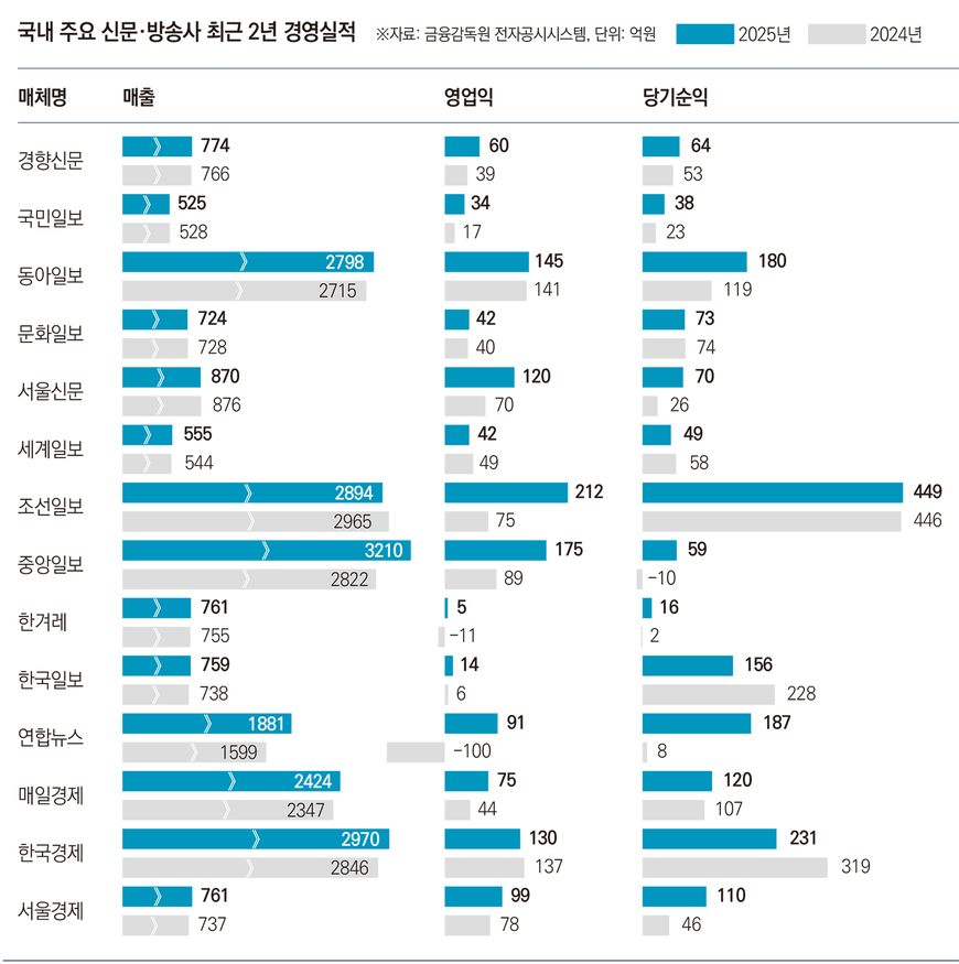 반면 조선일보는 매출이 3년 연속 감소하고 있는 추세다. 다만 영업이익은 전년 대비 182.7% 급증한 212억원을 기록해 조사 대상 언론사 중 영업이익 1위를 차지했다. 매출원가와 판매비·관리비 절약 등 긴축경영 기조가 확인된다. 조선일보 감사보고서에 따르면 매출원가는 2024년 1934억원에서 2025년 1798억원으로 약 136억원 감소했는데, 매출액 감소분(71억원)보다 원가 감소분이 더 커 결과적으로 매출총이익(1096억원)이 증가한 것이 주요하다. 또한 퇴직급여, 복리후생비, 임차료 등의 판관비 역시 전년보다 71억원 감소했다.