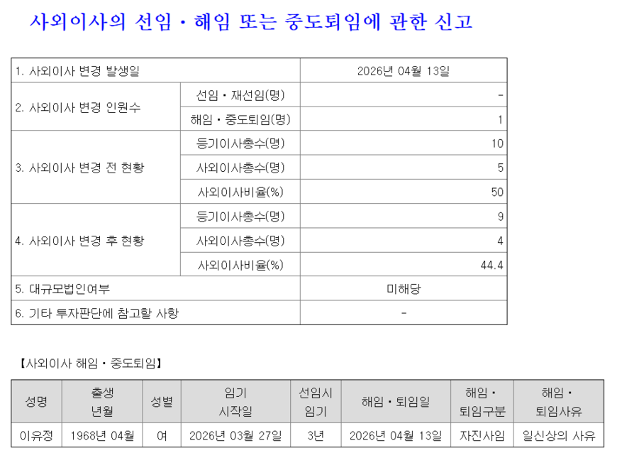 YTN은 이유정 사외이사가 사퇴해 이사회 구성이 변경됐다고 14일 공시했다. 회사는 사외이사 변경 발생일을 13일로 밝히며, 일신상의 사유에 따른 자진 사임이라고 적시했다. 이로써 YTN 이사회는 10인에서 9인 체제가 됐다. 앞서 사외이사 후보자로 내정됐다가 주주총회 전 사의를 밝히고 물러난 공훈의 전 위키트리 대표까지 치면 한 달 새 두 번째 사임이다.