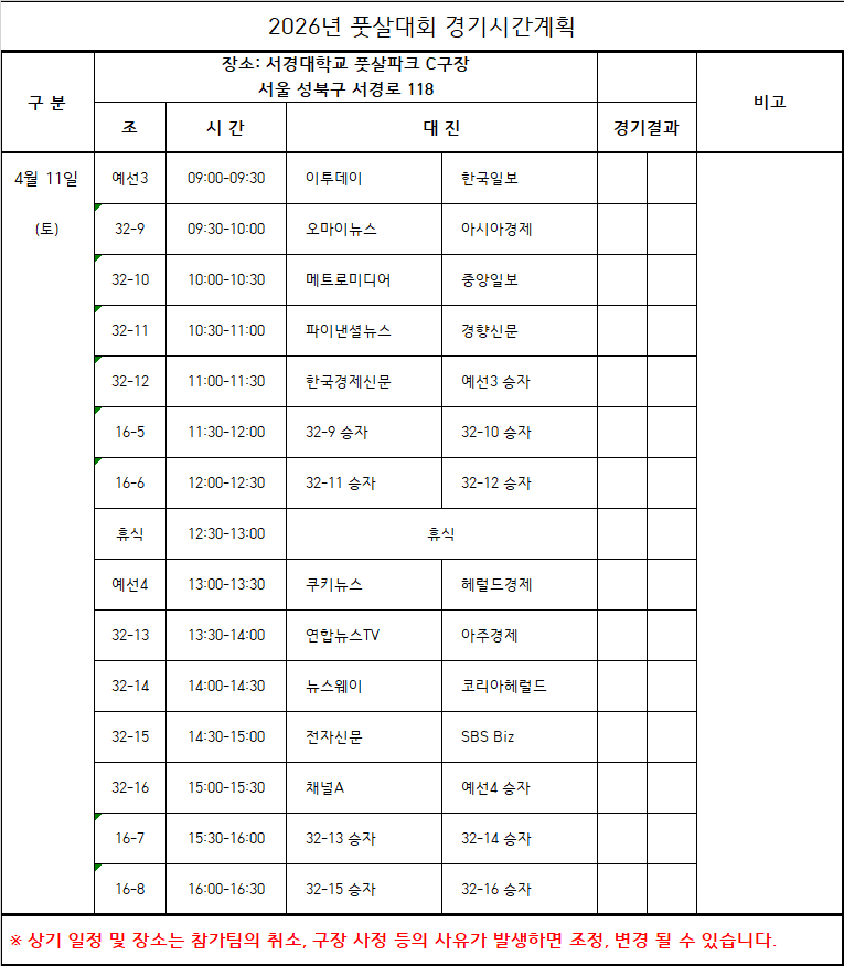 4 | 11, | 대회 진행 | 서경대 풋살파크 | 전후반 각 10분 연장전 X. 승부차기 진행 |