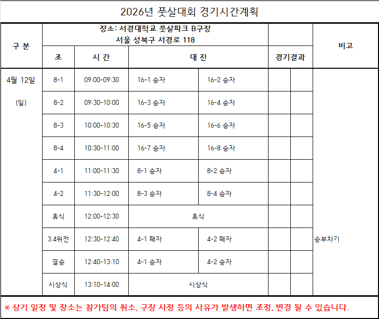 ▲ 우천 또는 기타의 사유로 경기 진행이 불가능할 경우 대회 주최 측 결정에 따른다.