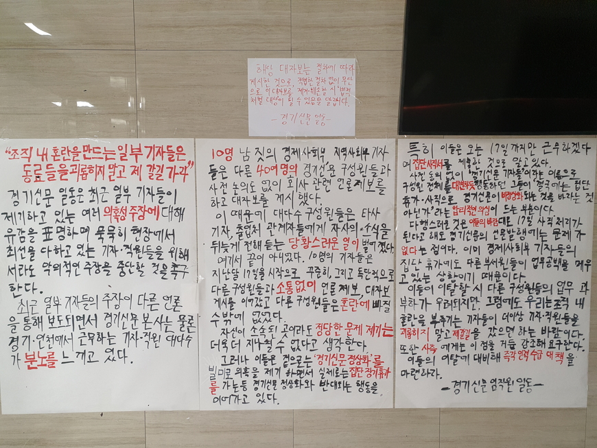반면 경기신문에 남아있는 기자들은 7일 사내에 대자보를 붙이고 사직서를 낸 기자들을 정면 비판했다. 이들은 ‘경기신문 임직원 일동’ 명의의 입장문에서 “최근 일부 기자들이 제기하고 있는 여러 의혹성 주장에 대해 유감을 표명하며 묵묵히 현장에서 최선을 다하고 있는 기자 및 직원들을 위해서라도 악의적인 주장을 중단할 것을 촉구한다”면서 “10명 남짓의 경제사회부, 지역사회부 기자들은 다른 40여명의 경기신문 구성원들과 어떠한 사전 논의도 없이 회사 관련 언론 제보를 하고 대자보를 게시했다. 이 때문에 대다수 구성원들은 타사 기자, 출입처 관계자들에게 자사의 소식을 뒤늦게 전해 듣는 당황스러운 일이 벌어졌다”고 밝혔다.