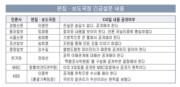 중앙언론사 편집·보도국장들은 ‘안기부 X파일(불법 도청테이프)’의 내용을 공개해야 한다는 의견이 많은 것으로 나타났다.
