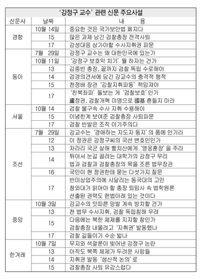 실제로 동아 조선 등은 강 교수의 발언을 연일 의제화하고 법무장관의 검찰수사지휘권 부당성을 집중 성토했다.